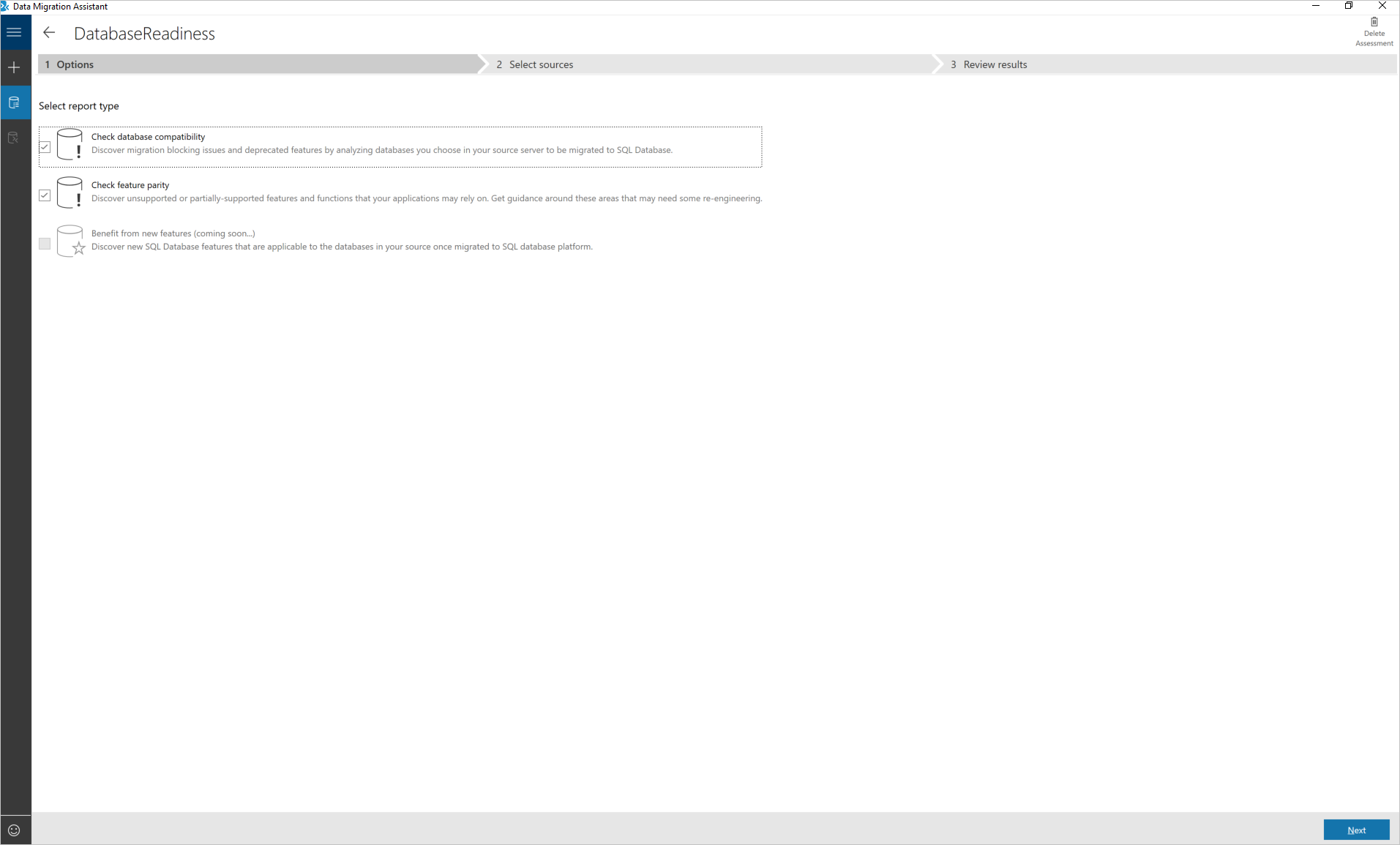 Screenshot of Azure Migrate - Data Migration Assistant - assessment options screen.