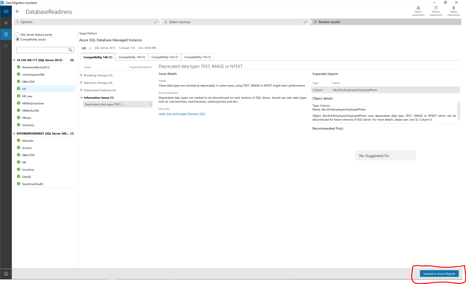 5. Review the DMA assessment results to get more details around the migration blockers.