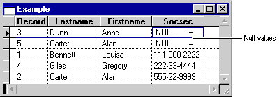When the index expression contains null values, the records whose SocSec values are .NULL. are sorted first (by LastName), followed by the records whose SocSec values are non-null. Notice that there are two entries for Alan Carter. Because record 5 contains a null value, record 5 is indexed before record 2.