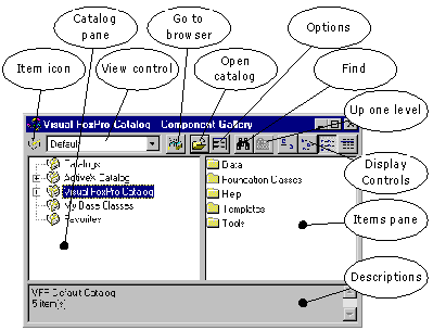 Item Type: A category that defines the behavior of the items in the catalog. The default item types are stored in the home( )+"\Gallery\VfpGlry.VCX" class library, and are configurable for each catalog. (For each catalog, see the Properties dialog box, available on the Shortcut menu). The root catalog, always named "Catalogs," contains the default item types that all catalogs inherit.