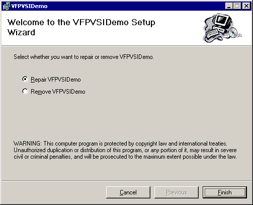 Open the VFPVSIDemo Setup Wizard. Choose RepairVFPVSIDemo to reinstall the application. Choose RemoveVFPVSIDemo to uninstall the application. Then choose Finish.