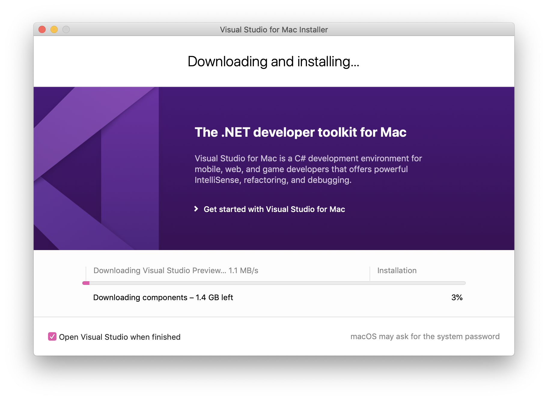8. The installer will display progress as it downloads and installs Visual Studio for Mac and the selected workloads. You'll be prompted to enter your password to grant the privileges necessary for installation.