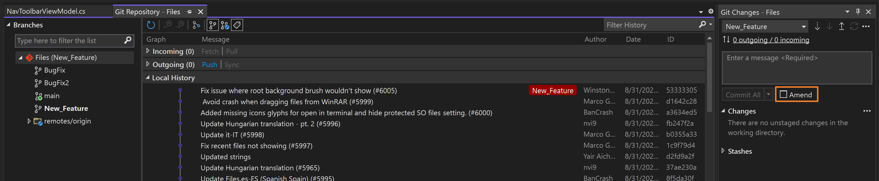 If you need to include code changes to your last commit, you can do that in the Git Changes window. Select the Amend checkbox and then commit your changes.