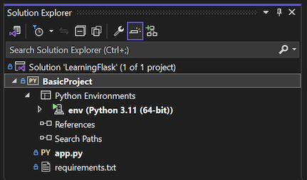 1. Open Solution Explorer to view your solution and Flask project files. The initial project contains only two files, app.py and requirements.txt: