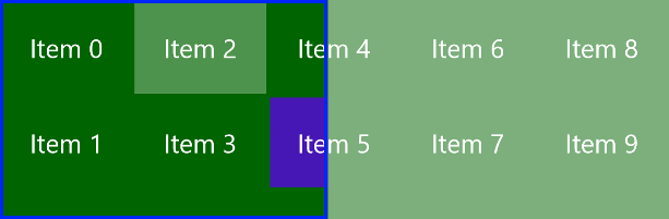 Other containers let their children use unlimited space to display their content, even if the space extends beyond the visible bounds of the container. Here, we place the same GridView inside a Canvas. The visible bounds of the Canvas are outlined in blue. The viewport of the GridView grows to fit all its items, and stretches beyond the visible bounds of the container. (The grayed out items in this image are not visible in an actual app.) There are no scroll bars, so the user can't scroll hidden items into view.
