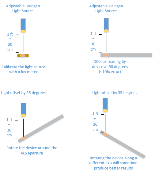 Place the System Under Test so that the ALS aperture is directly under the light with NO offset (top-right image below). The device must read within +/- 10% accuracy: 90-110 lux.