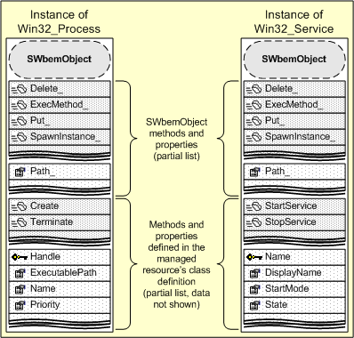 SWbemObject is the multiple-identity object that masquerades as the resource you're managing. For example, if you retrieve instances of the Win32_Process managed resource, SWbemObject takes on an identity modeled after the Win32_Process class definition, as shown on the left of Figure 2. On the other hand, if you retrieve instances of the Win32_Service managed resource, SWbemObject takes on an identity modeled after the Win32_Service class, as shown on the right of Figure 2.