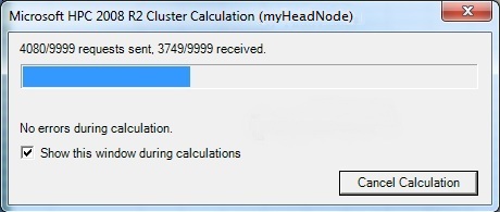 The cluster connector also provides a message box that communicates the progress of the cluster calculation. The following screenshot shows the progress message box. In the screenshot, the title bar displays the name of the cluster that is performing the calculations, in this case myHeadNode. The message and the progress bar indicate the number of messages that are being sent and received.
