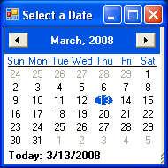 Note. Does that mean you can select more than one date? As a matter of fact it does: you can actually select a range of dates. To do that, set the MaxSelectionCount property to the maximum interval allowed between the starting date and ending date. For example, if you want to allow no more than 10 days between the two dates then set MaxSelectionCount to 10. After that, use the SelectionStart property to determine the starting date and the SelectionEnd property to determine the ending date. |