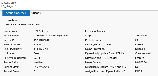 The following example shows how IPAM’s MSM feature enables you to monitor IP DHCP scopes on the network. In this example, detailed data is displayed for the scope US_SEA_zzz3.