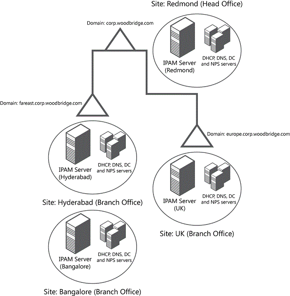 The following example displays the distributed IPAM deployment method, with one IPAM server located at the corporate headquarters and also at each branch office. There is no communication or database sharing between different IPAM servers in the enterprise. If multiple IPAM servers are deployed, you can customize the scope of discovery for each IPAM server, or filter the list of managed servers. A single IPAM server might manage a specific domain or location, perhaps with a second IPAM server configured as a backup.