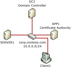 The following Windows PowerShell script establishes a connection security rule that uses IKEv2 for communication between two computers (CLIENT1 and SERVER1) that are joined to the corp.contoso.com domain as shown in Figure 1.