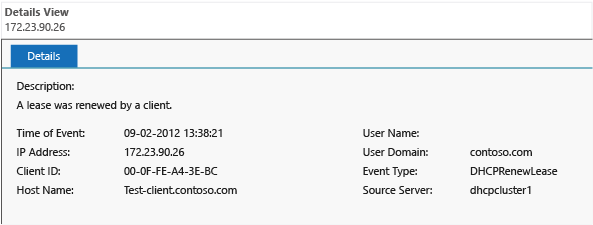 The following example shows how IPAM’s network audit feature enables you to track IP addresses on the network. In this example, details are displayed for a lease event in the contoso.com domain.