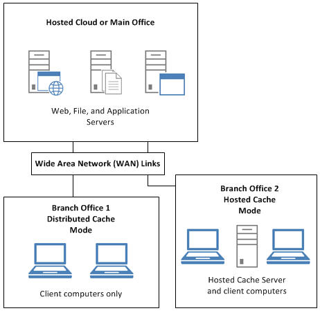 At branch offices, content is stored either on servers that are configured to host the cache or, when no server is available in the branch office, on client computers that are running Windows 8 or Windows 7. After a client computer requests and receives content from the main office and the content is cached at the branch office, other computers at the same branch office can obtain the content locally rather than downloading the content from the content server over the WAN link.