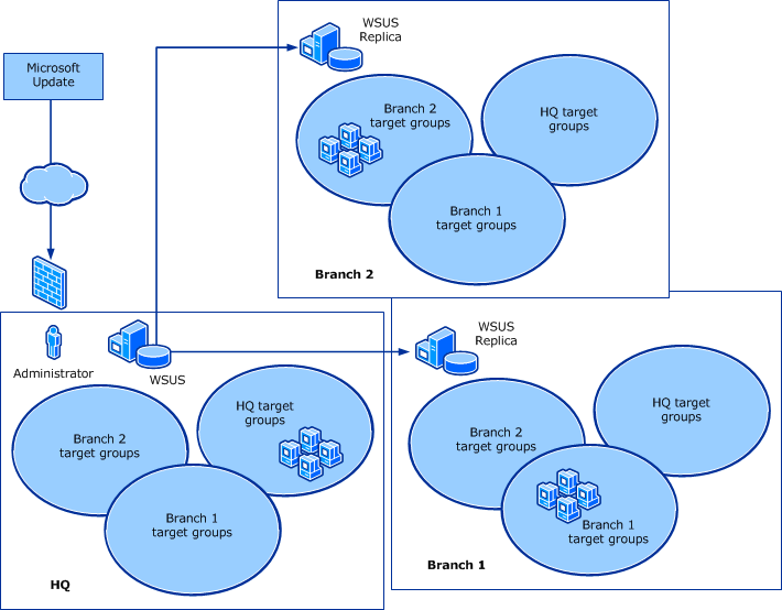 The Replica mode, also called centralized administration, works by having an upstream WSUS server that shares updates, approval status, and computer groups with downstream servers. Replica servers inherit update approvals and are not administered separately from the upstream WSUS server. The following image shows how you might deploy replica WSUS servers in a branch office environment.