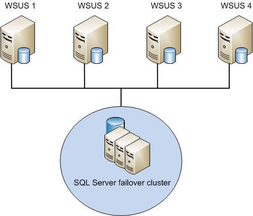 Network Load Balancing (NLB) increases the reliability and performance of your WSUS network. You can set up multiple WSUS servers that share a single failover cluster running SQL Server 2008 R2 SP1. In this configuration you must use a full SQL Server installation, not the Windows Internal Database installation that is provided by WSUS, and the database role must be installed on all WSUS front-end servers. You can also have all the WSUS servers use a distributed file system (DFS) to store their content.