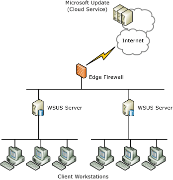 The following figure shows a simple WSUS server scenario in which an administrator can set up a server running WSUS inside the corporate firewall, which synchronizes content directly with Microsoft Update and distributes updates to client computers.