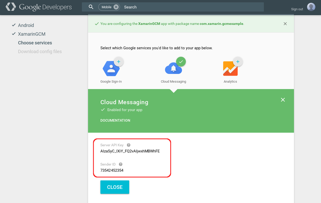 A Server API key and a Sender ID are generated for your app. Record these values and click CLOSE: