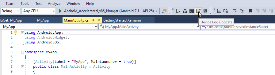 It is also possible to use Console.WriteLine to write to the Debug Log – these messages appear in logcat with a slightly different output format (this technique is particularly useful when debugging Xamarin.Forms apps on Android):