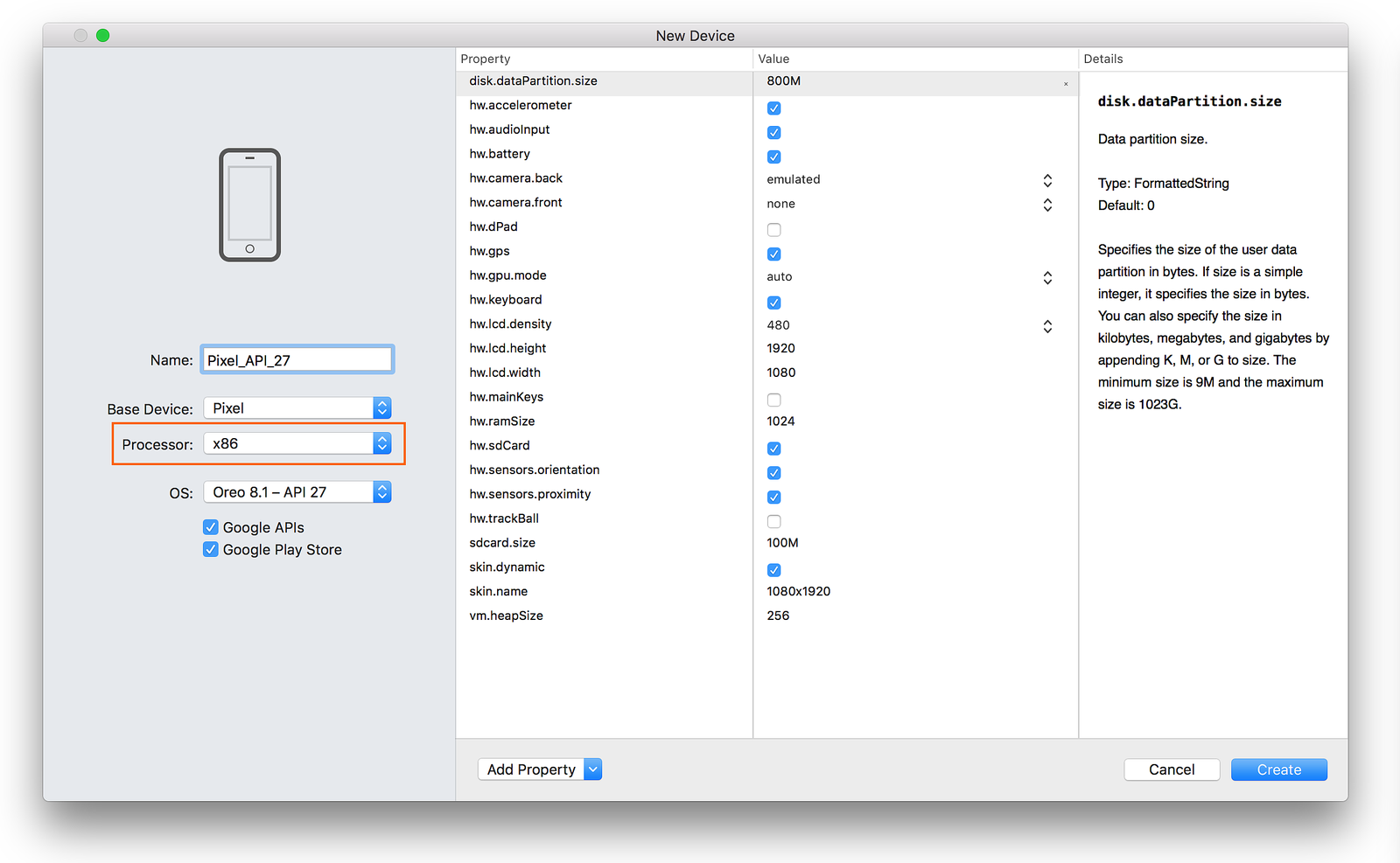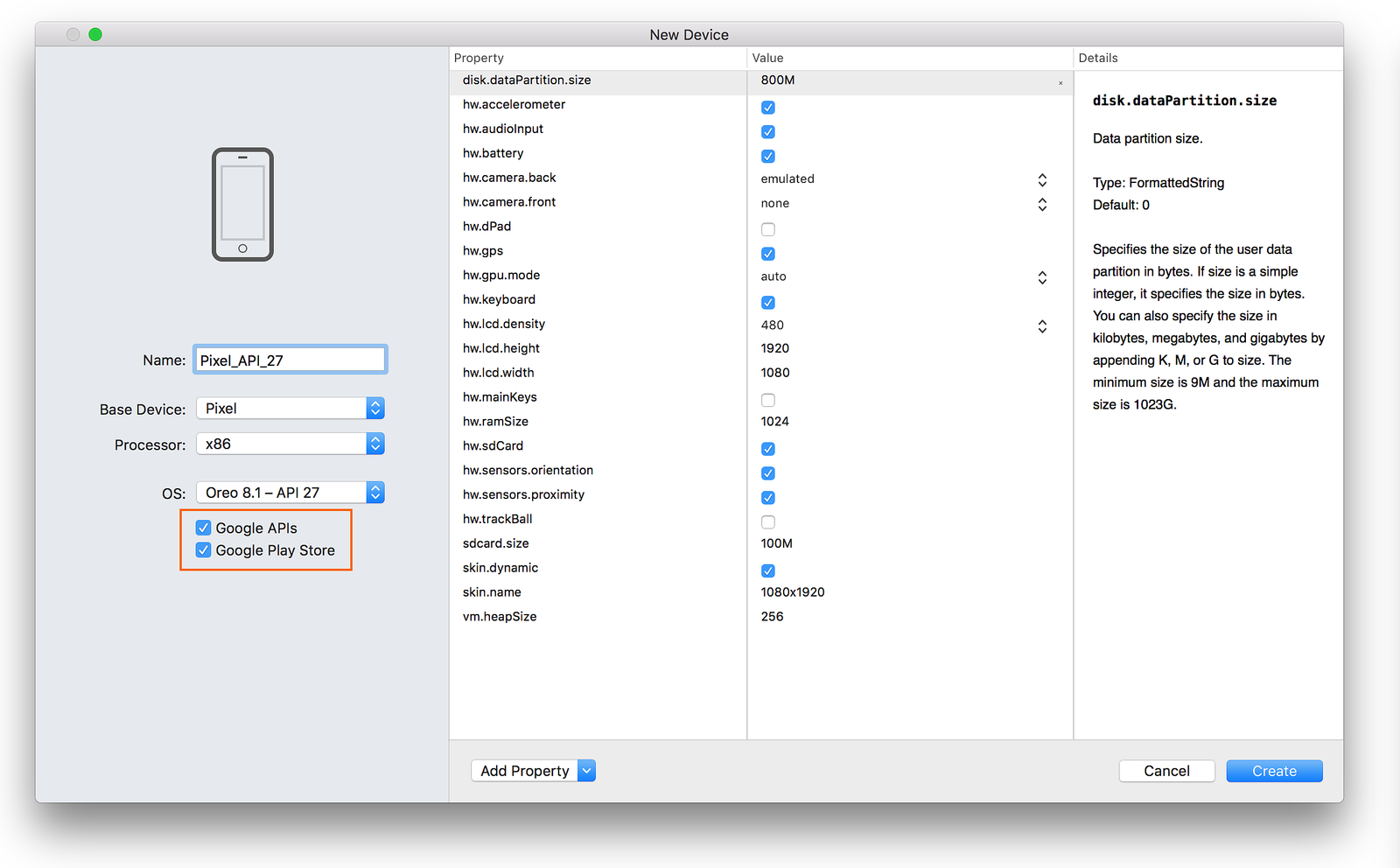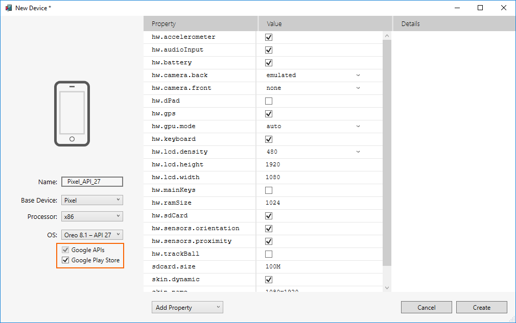 For example, this virtual device will include Google Play Services and Google Play Store: