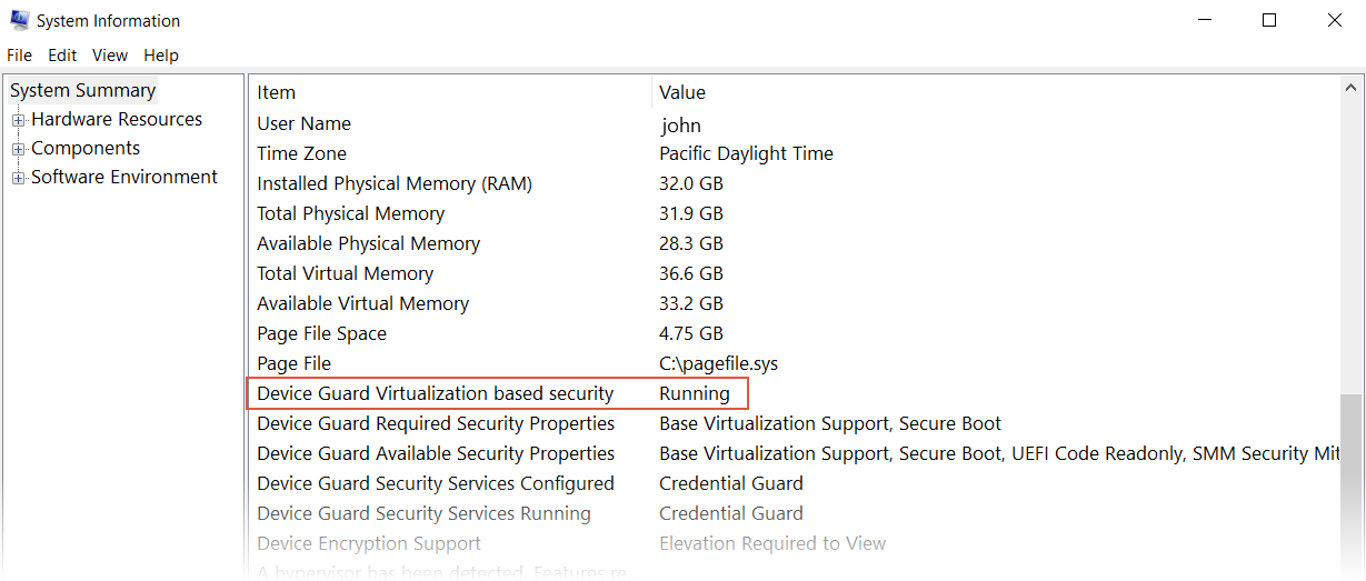 In the System Summary, look to see if Device Guard Virtualization based security is present and is in the Running state: