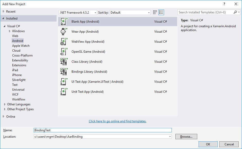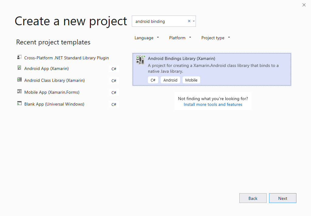 1. Create a new Bindings Library project starting with the Android Bindings Library template. You can use either Visual Studio for Mac or Visual Studio (the screenshots below show Visual Studio, but Visual Studio for Mac is very similar). Name the solution AarBinding: