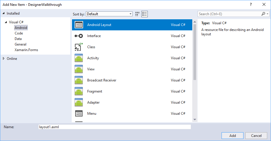 Likewise, you can add a new layout by right-clicking the layout folder in the Solution Explorer and selecting Add > New Item... > Android Layout: