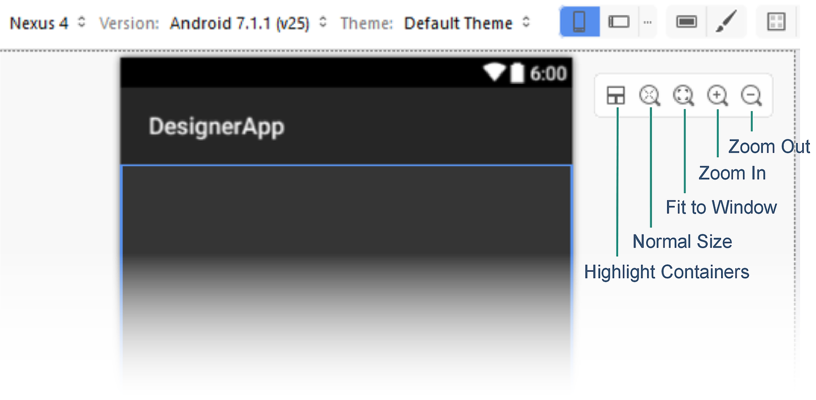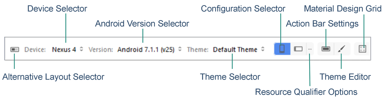 • Designer Toolbar – Displays a list of selectors: Device, Version, Theme, layout configuration, and Action Bar settings. The Designer Toolbar also includes icons for launching the Theme Editor and for enabling the Material Design Grid.