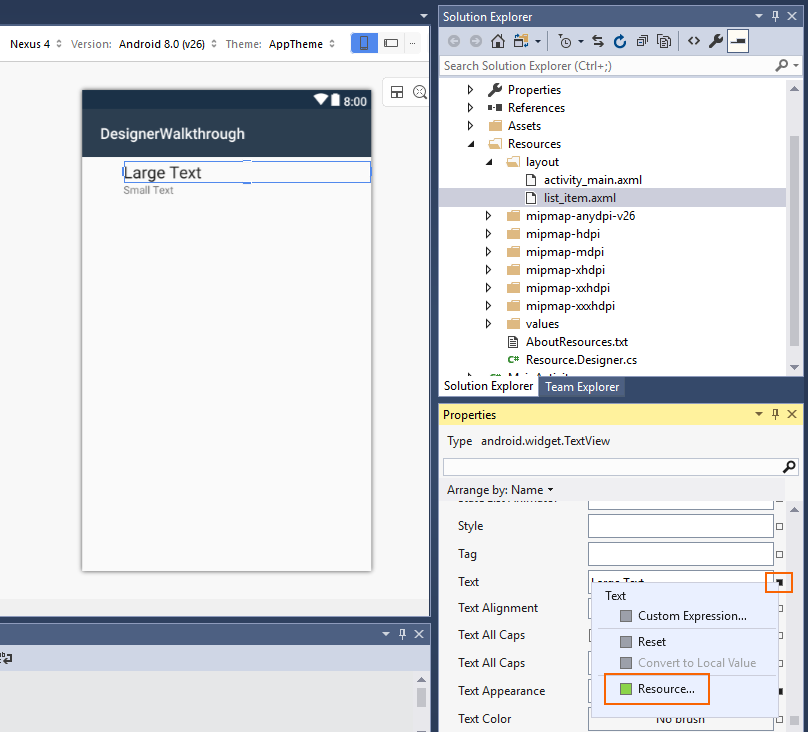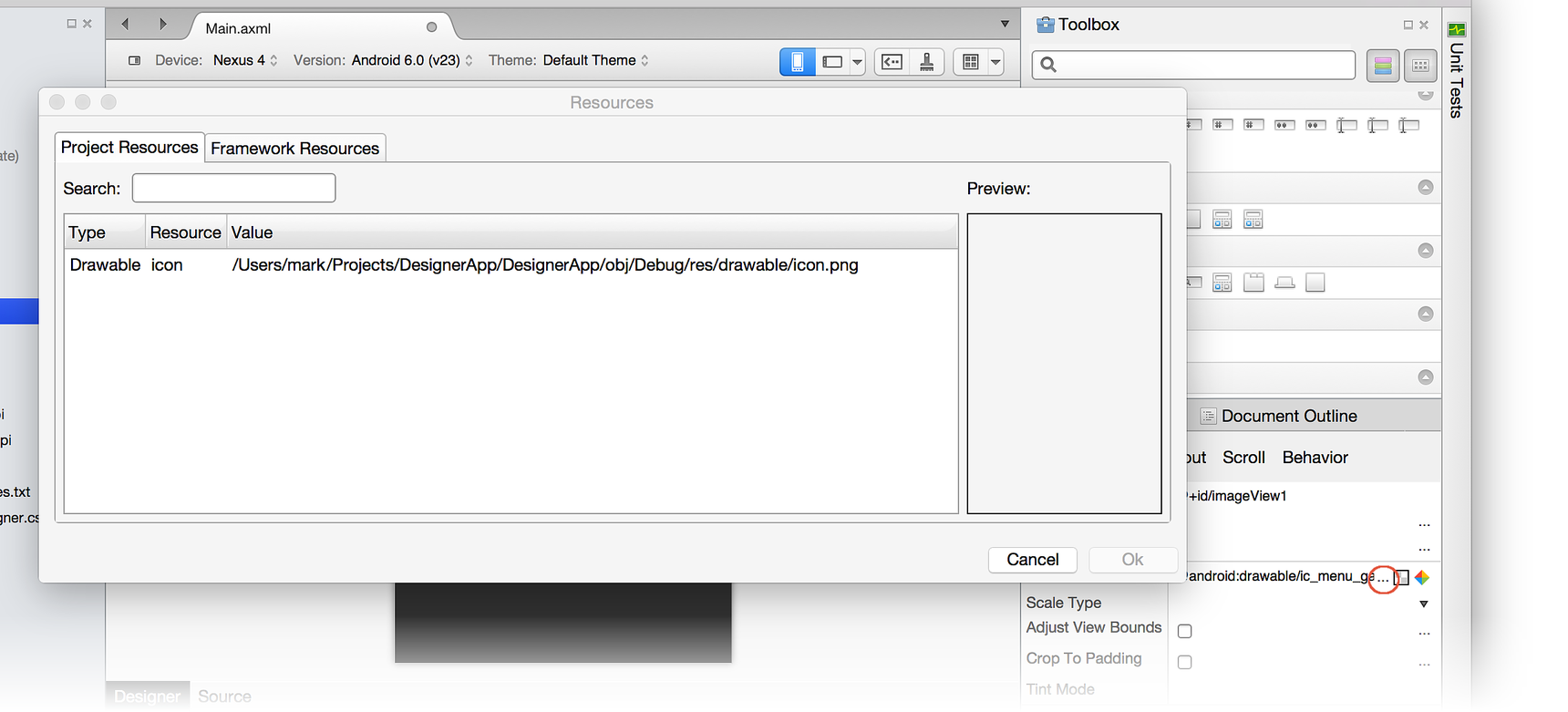 Some properties can reference resources that are defined in files other than the layout .axml file. The most common cases of this type are string and drawable resources. However, references can also be used for other resources, such as Boolean values and dimensions. When a property supports resource references, a browse icon (a square) is shown next to the text entry for the property. This button opens a resource selector when clicked.