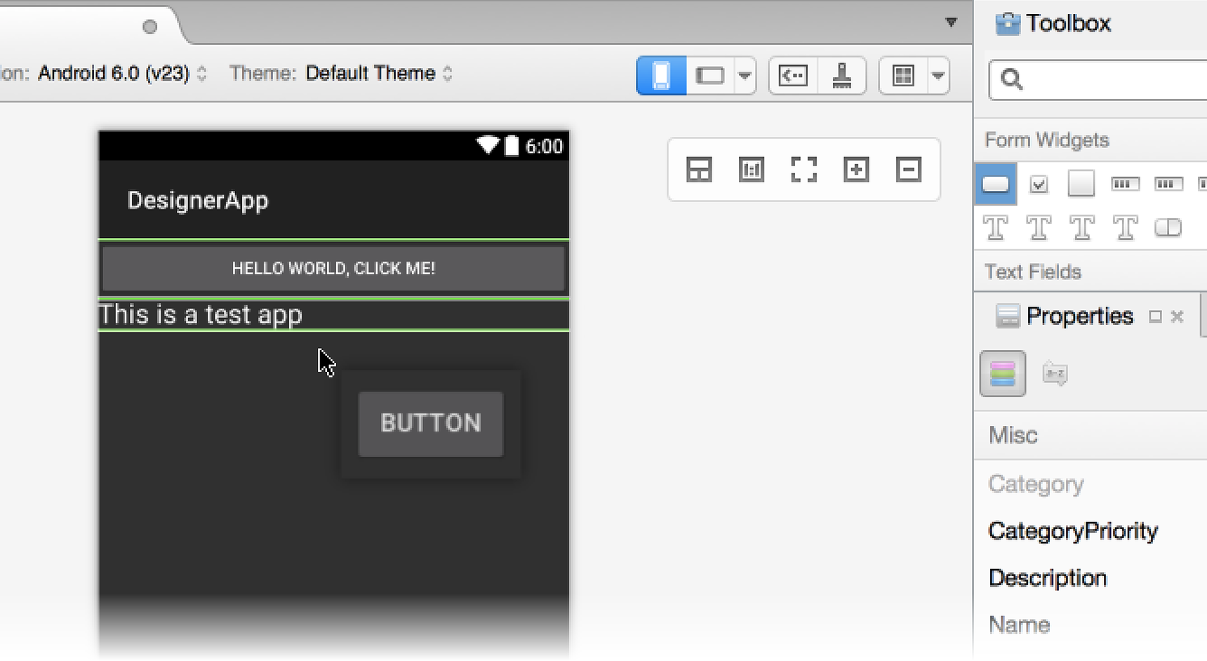 The text properties of some widgets (such as Button and TextView), can be edited directly on the Design Surface. Double-clicking a widget will put it into edit mode, as shown below: