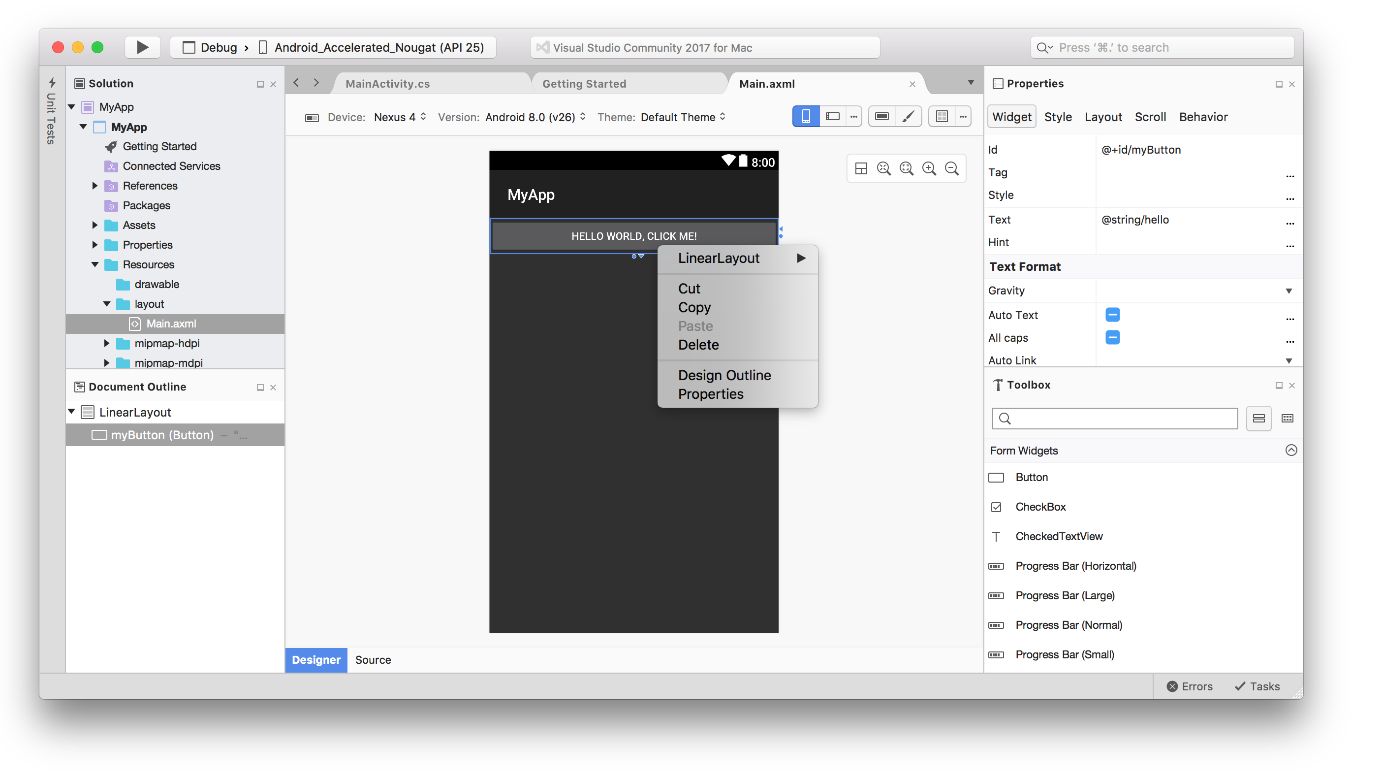 The Designer is launched automatically when a layout is created, or it can be launched by double-clicking an existing layout file. For example, double-clicking activity_main.axml in the Resources > Layout folder will load the Designer as seen in this screenshot: