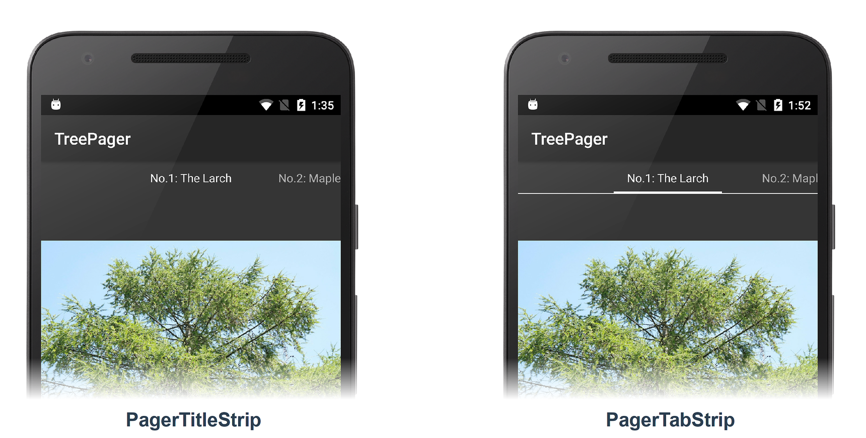 TreePagerapp is developed to demonstrate how to useViewPagerto display views of a tree catalog (an image gallery of deciduous and evergreen trees).PagerTabStripandPagerTitleStripare used to display titles that help with page navigation.In Viewpager with Fragments, a slightly more complex FlashCardPager app is developed to demonstrate how to use