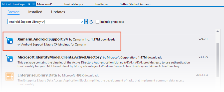 Create a new Android project called TreePager (see Hello, Android for more information about creating new Android projects). Next, launch the NuGet Package Manager. (For more information about installing NuGet packages, see Walkthrough: Including a NuGet in your project). Find and install Android Support Library v4: