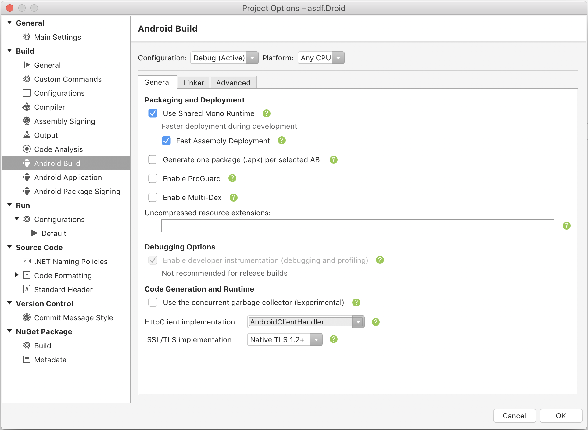 Android project options also let you choose which SSL/TLS implementation to support:
