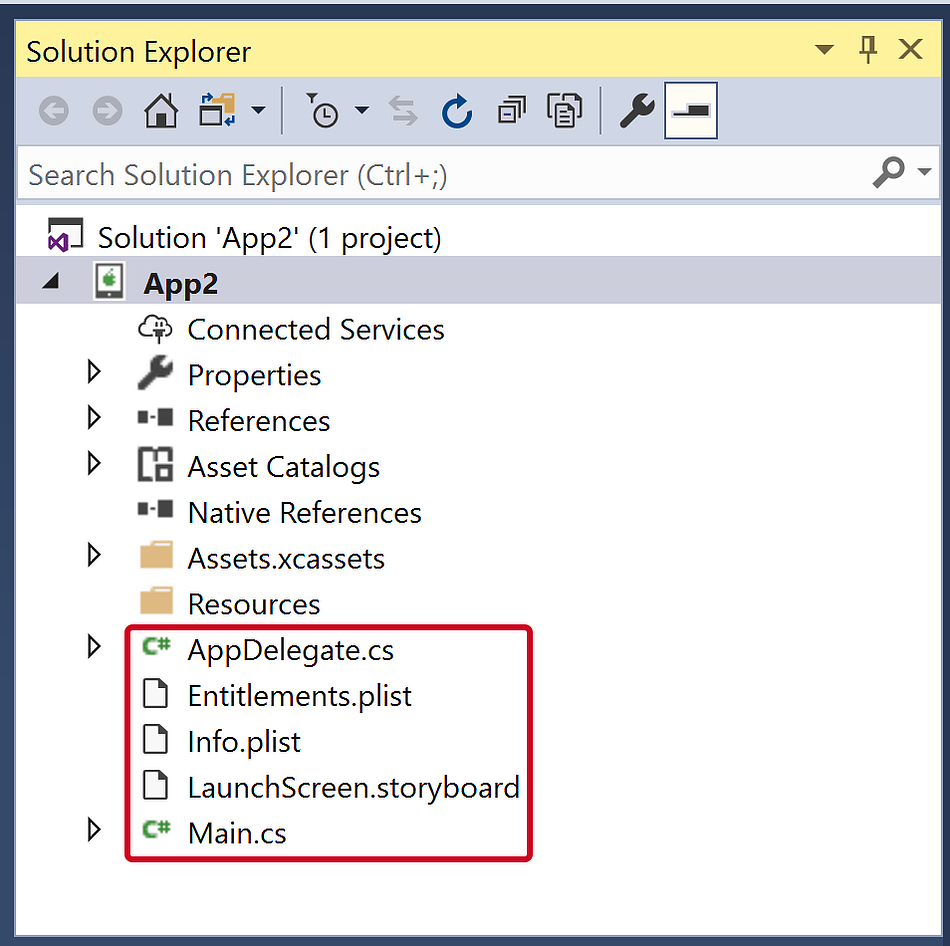 UIApplicationDelegatesubclass,AppDelegate, which is used to handle application events from iOS. The application window is created in theAppDelegate'sFinishedLaunchingmethod. - Main.cs - Contains the entry point for the application, which specifies the class for the