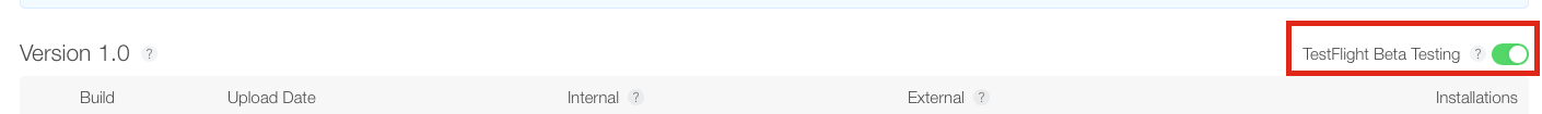 When you are ready to start testing your app, turn on the TestFlight Beta Testing switch for your version: