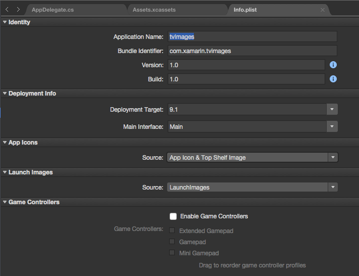 As stated above, all tvOS apps require a Launch Image, and App Icon. This section covers selecting the Launch Image and App Icon for your Xamarin.tvOS app project after they have been set in an Asset Catalog.