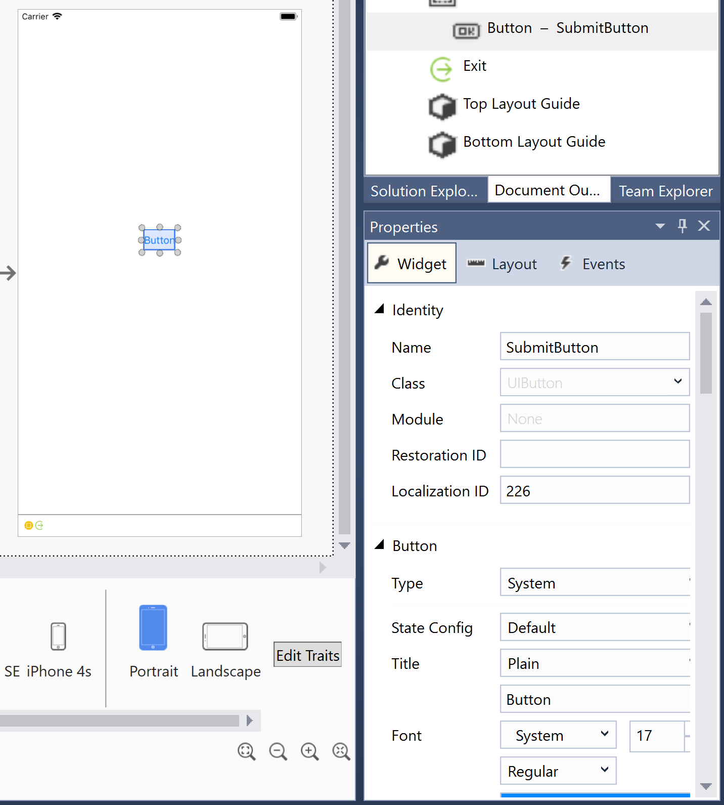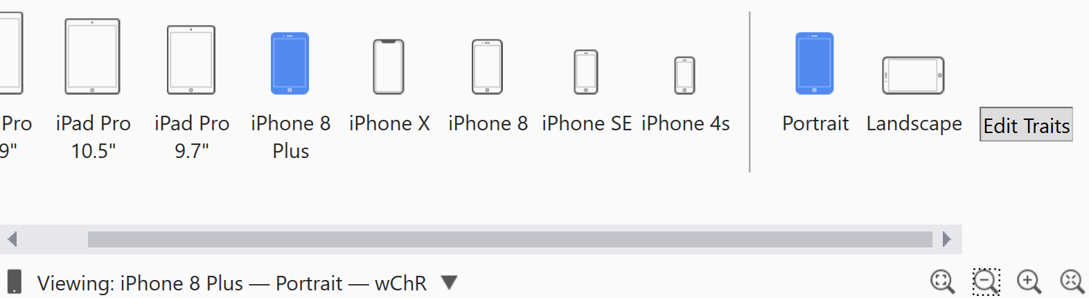 Note that selecting a device and orientation changes only how the iOS Designer previews the design. Regardless of the current selection, newly added constraints are applied across all devices and orientations unless the Edit Traits button has been used to specify otherwise.