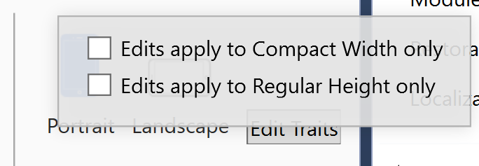When size classes are enabled, the Edit Traits button will appear in the expanded bottom toolbar. Clicking the Edit Traits button displays options for creating an interface variation based on the size class represented by the selected device and orientation. Consider the following examples: