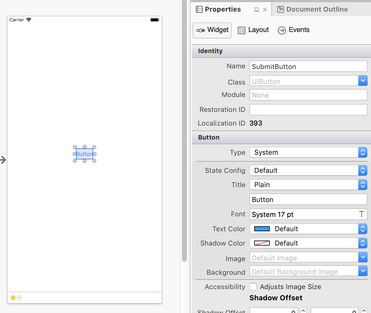 - Document Outline – Shows the tree of controls that compose the layout for the interface being edited. Clicking on an item in the tree selects it in the iOS Designer and shows its properties in the Properties Pad. This is handy for selecting a specific control in a deeply-nested user interface.