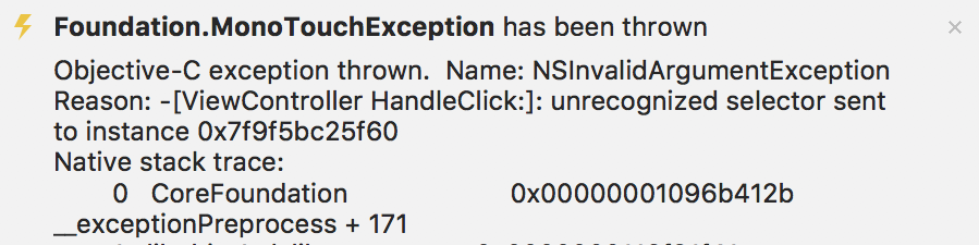 Once an event handler has been specified, a method of the same name must be added to the corresponding view controller class. Otherwise, an unrecognized selector exception will occur when the button is tapped: