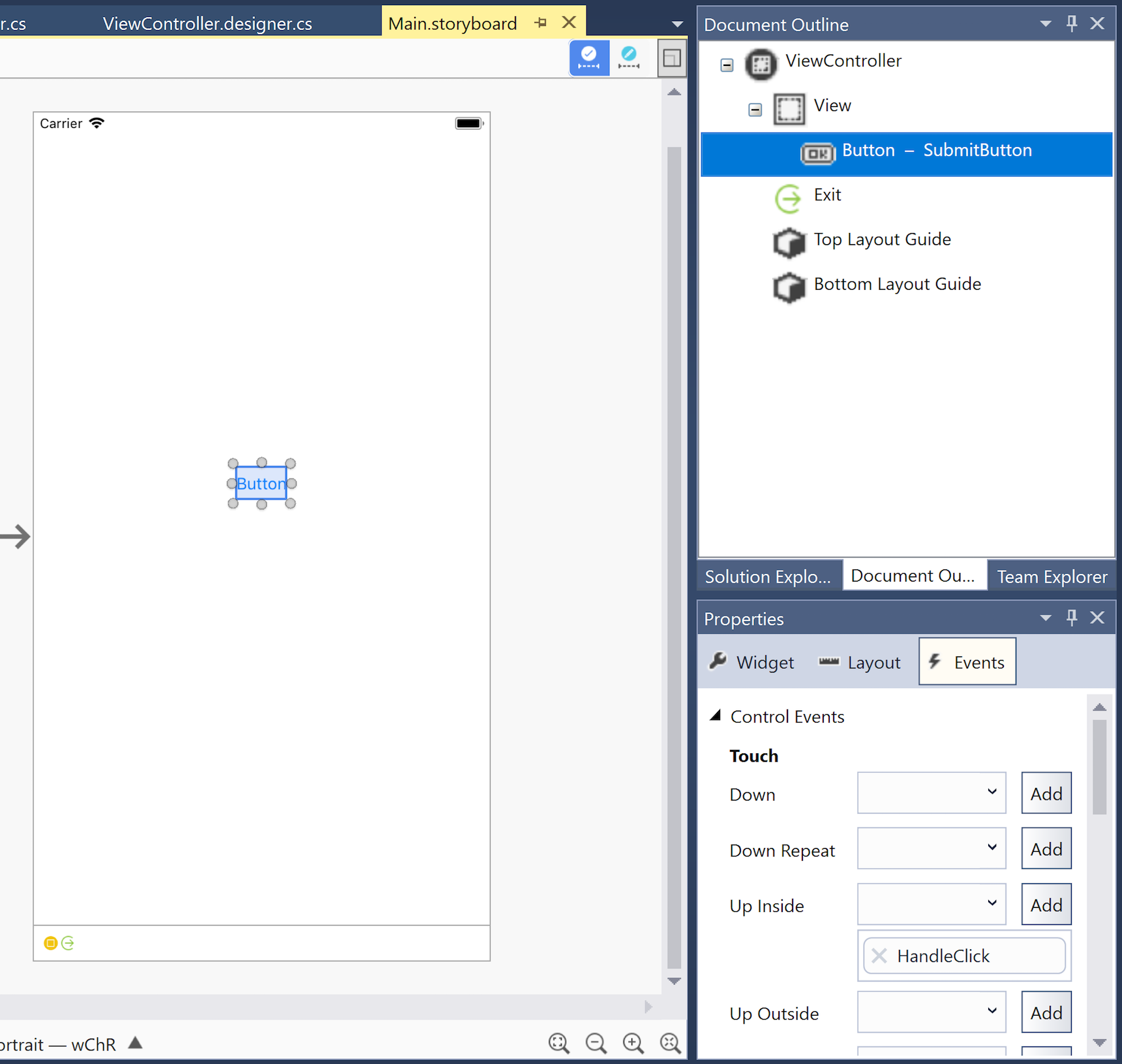 To specify custom event handlers for various events, use the Events tab of the Properties Pad. For example, in the screenshot below, a HandleClick method handles the button's Touch Up Inside event:
