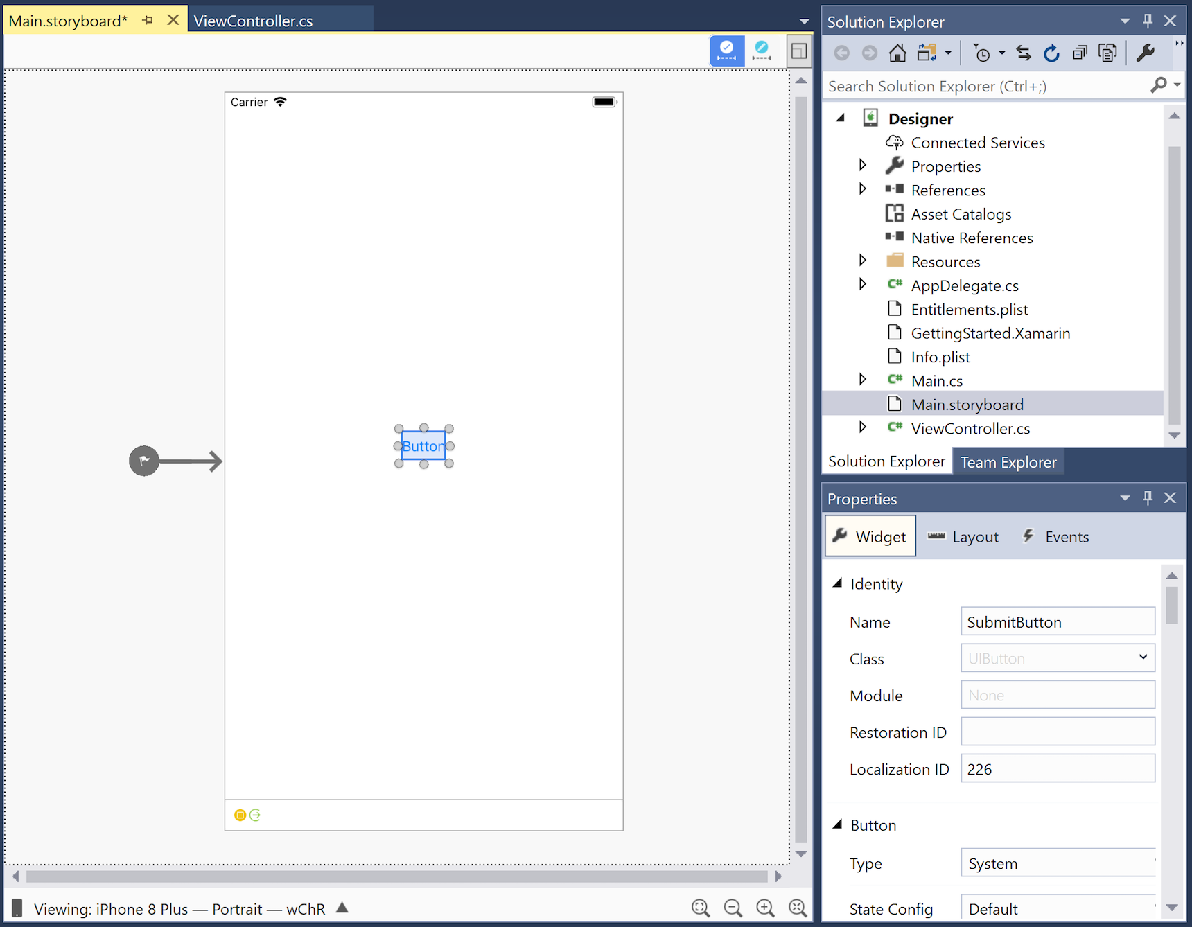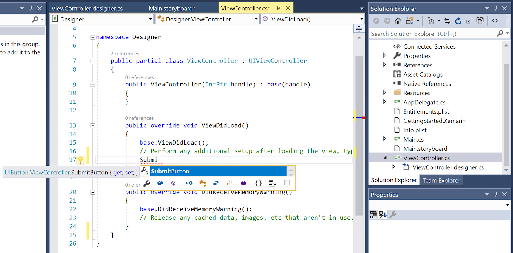 The following screenshot illustrates that IntelliSense now recognizes the SubmitButton reference in ViewController.cs: