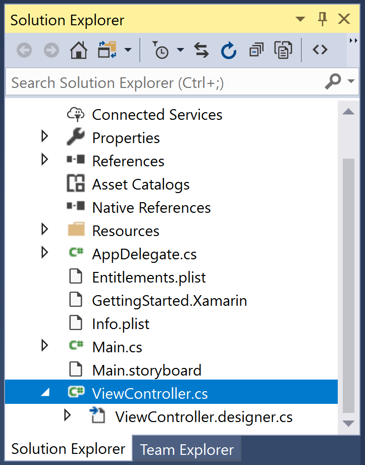 ViewControllerclass. In this file, theViewControllerclass can respond to various iOS view controller lifecycle methods, customize the UI, and respond to user input such as button taps.ViewController.designer.cs is a generated file, created by the iOS Designer to map the visually-constructed interface to code. Since changes to this file will be overwritten, it should not be modified. Property declarations in this file make it possible for code in the