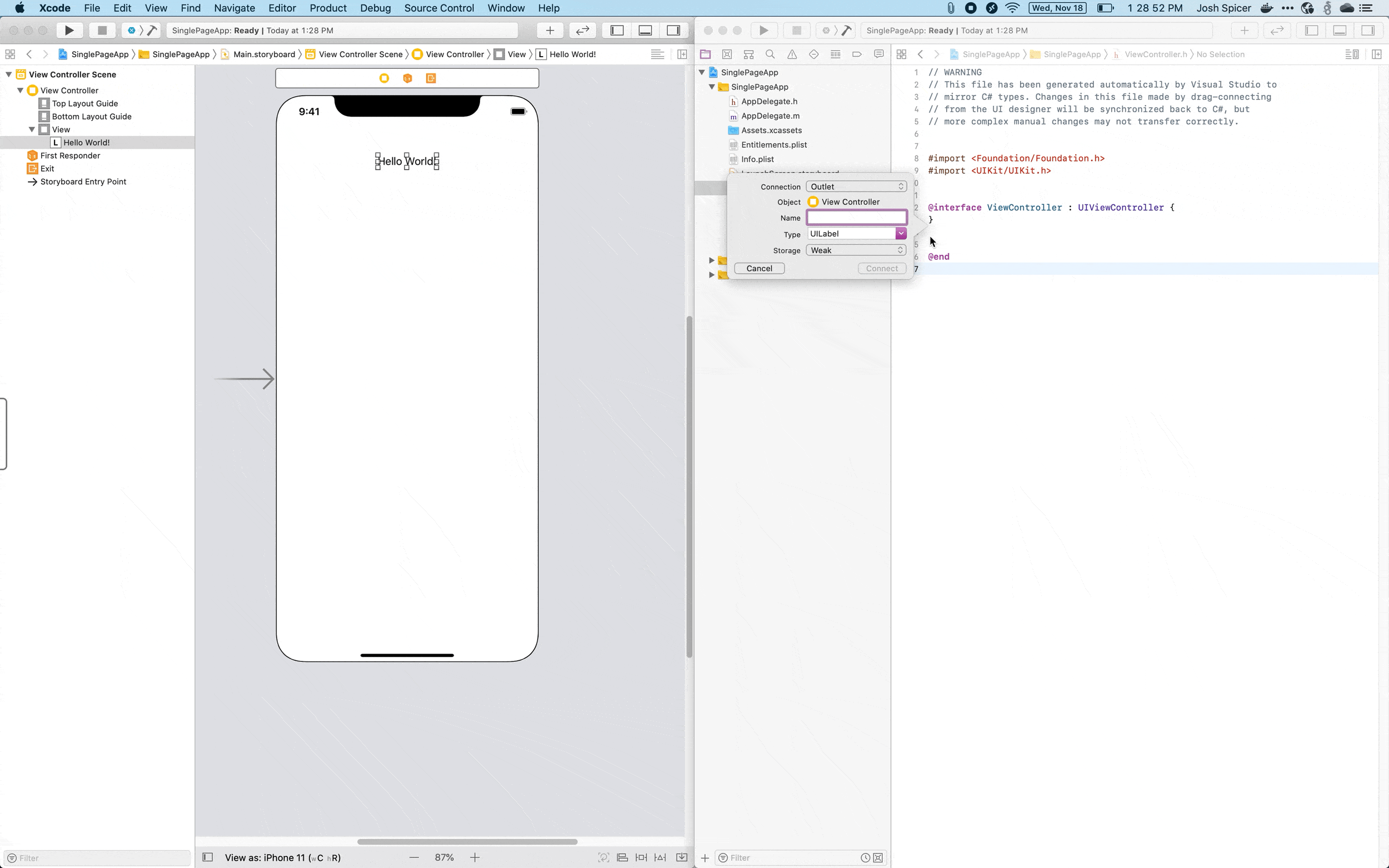 Next, open up the corresponding view controller header file. For a blank "Single View" Xamarin.iOS app, the default storyboard is called Main.storyboard. The corresponding view controller file is called ViewController.cs in Visual Studio with a corresponding ViewController.h header file when viewed from Xcode.
