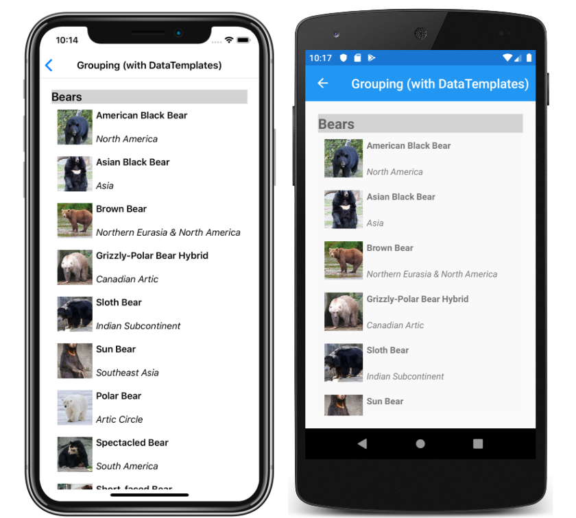 In this example, each group header is set to a Label that displays the group name, and that has other appearance properties set. The following screenshots show the customized group header:
