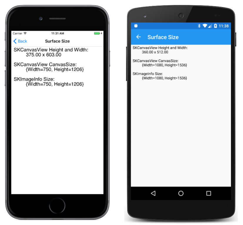 As you can see, the CanvasSize property of the SKCanvasView and the Size property of the SKImageInfo value are consistent in reporting the pixel dimensions. The Height and Width properties of the SKCanvasView are Xamarin.Forms properties, and report the size of the view in the device-independent units defined by the platform.
