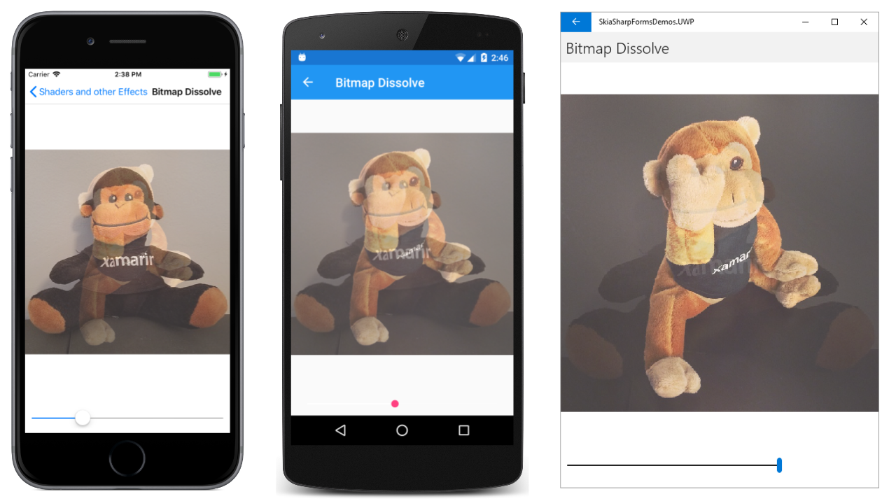 Bitmap transparency is demonstrated in the Bitmap Dissolve page. The XAML file instantiates an SKCanvasView and a Slider: