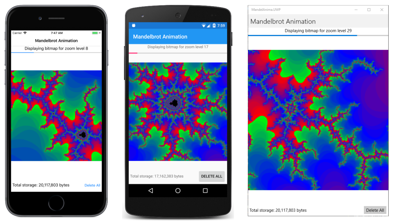 The Mandelbrot Animation sample stores these COUNT bitmaps in local application storage. Fifty bitmaps require over 20 megabytes of storage on your device, so you might want to know how much storage these bitmaps are occupying, and at some point you might want to delete them all. That's the purpose of these two methods at the bottom of the MainPage class: