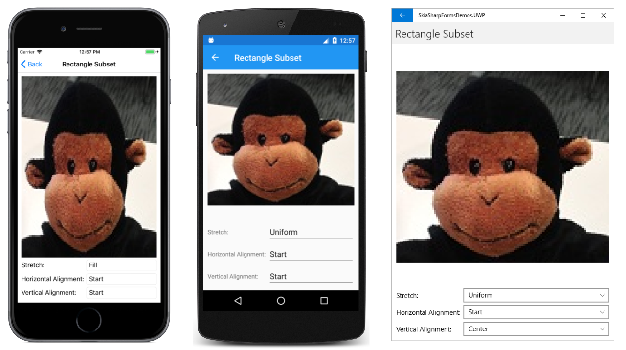 The first of these two new DrawBitmap methods is demonstrated in the Scaling Modes page. The XAML file contains three Picker elements that let you select members of the BitmapStretch and BitmapAlignment enumerations: